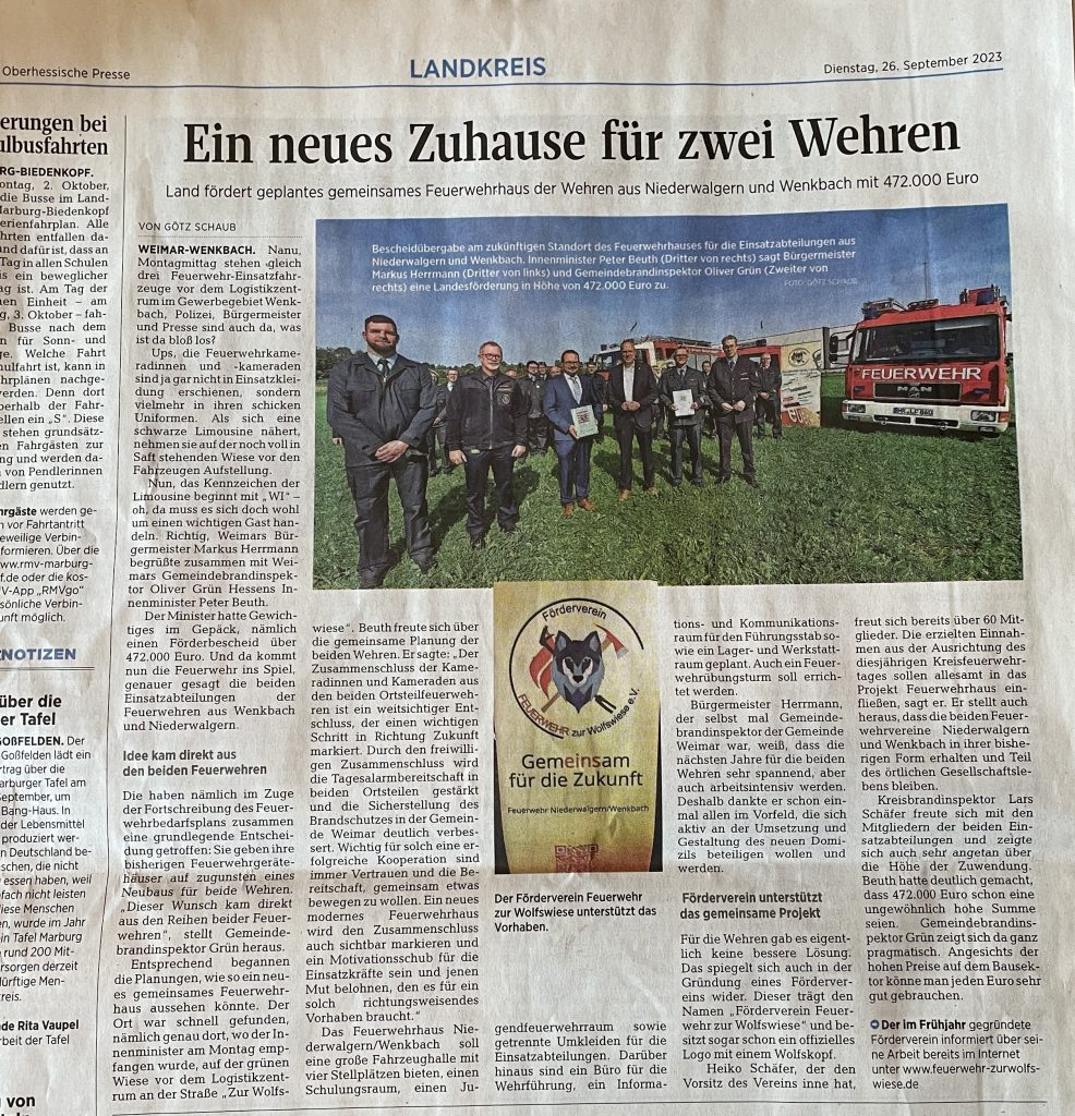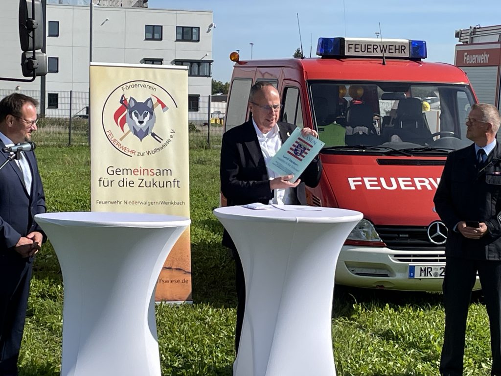 Am 25.09.2023 kam der Innenminister, und damit oberster Dienstherr des Feuerwehren in Hessen, Peter Beuth persönlich ins Industriegebiet Weimar-Wenkbach, um den Förderbescheid für das künftige Feuerwehrhaus über 472.000€ zu überreichen.